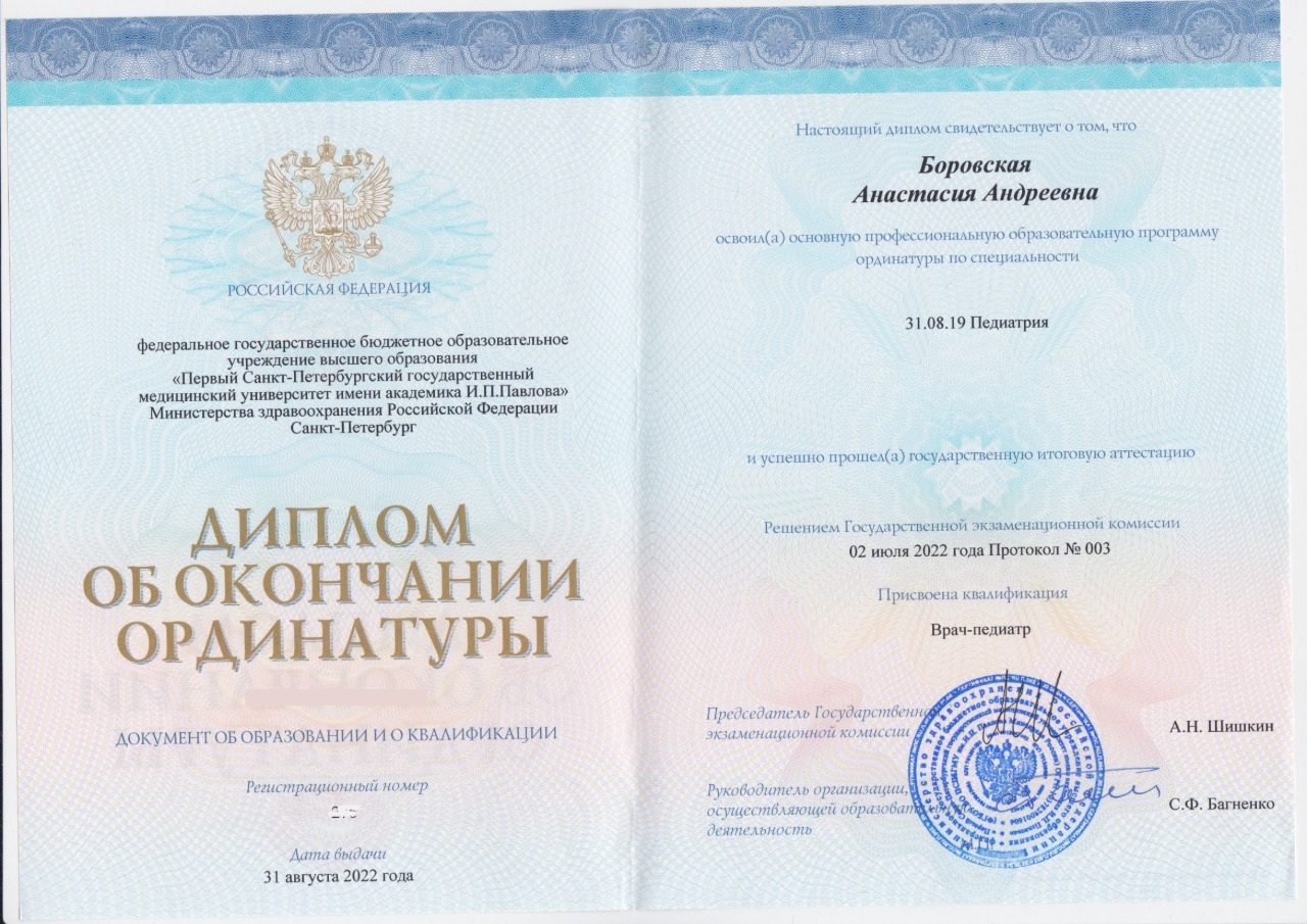 Анастасия Боровская - врач-педиатр. Окончила лечебный факультет Первого Санкт-Петербургского государственного медицинского университета имени академика И. П. Павлова и ординатуру по специальности «педиатрия». Присвоена квалификация врач-педиатр.
