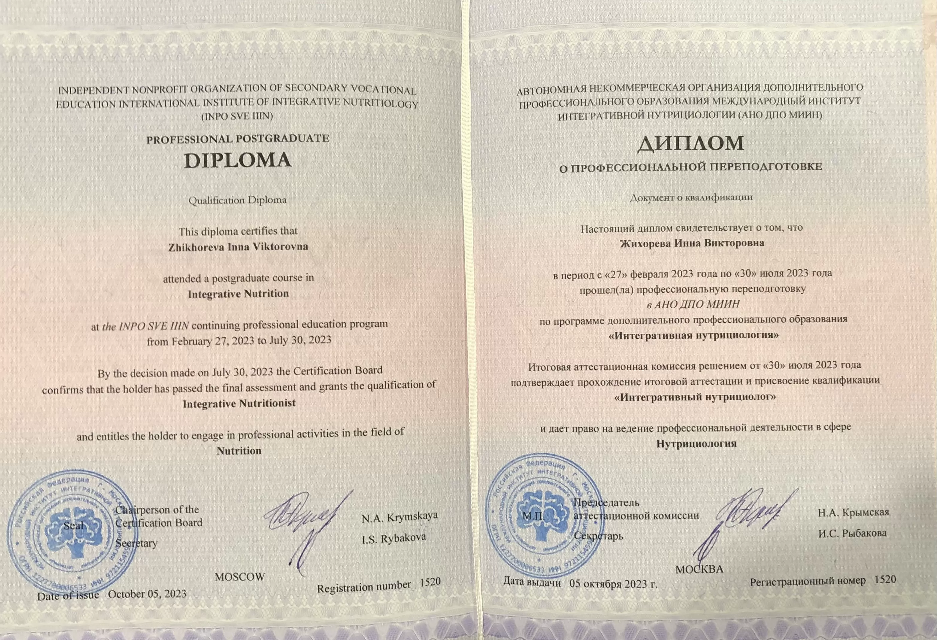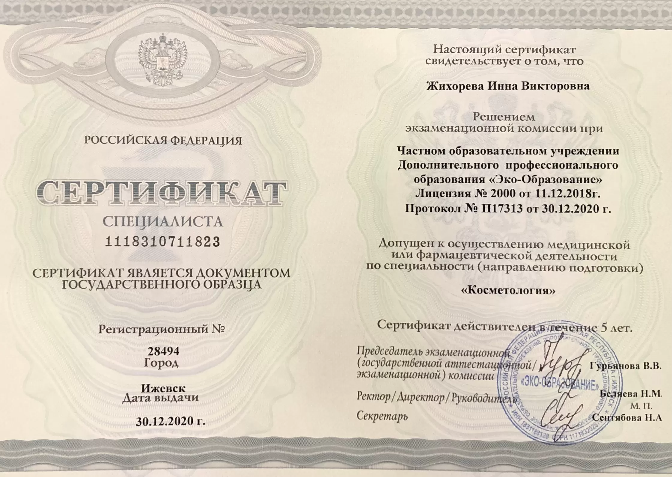 Инна Жихорева — врач-дерматовенеролог (детский и взрослый), косметолог и нутрициолог с 12-летним стажем работы. Окончила лечебный факультет Воронежской медицинской академии имени Н. Н. Бурденко, получила специализацию по дерматовенерологии в РМАНПО. Является членом Национального альянса дерматовенерологов и косметологов. Специализируется на комплексной диагностике и лечении кожных заболеваний, эстетической косметологии и нутрициологическом сопровождении пациентов.